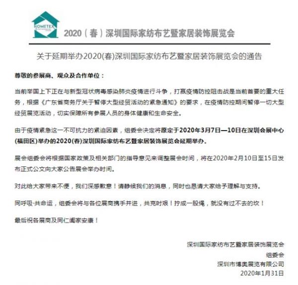 2020(春)深圳国际家纺布艺暨家居装饰展览会延期举办