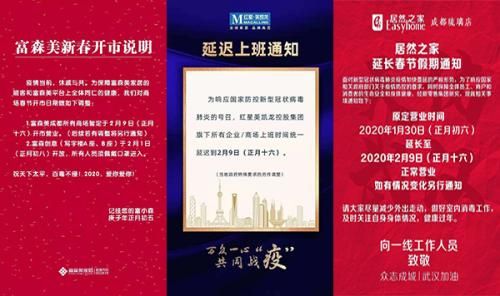 为了响应国家减少人群聚集防止疫情扩散的号召,富森美家居、红星美凯龙、居然之家、宜家、香江家居CBD等卖场的开市日期也暂定为2月9日或之后。全友家居、飞宇门窗、川豪装饰、鼎高家居、华润建材、鹏基石材等不少企业也将假期延长至2月9日或之后,并对复工的员工进行返程路线记录和身体健康状况记录。