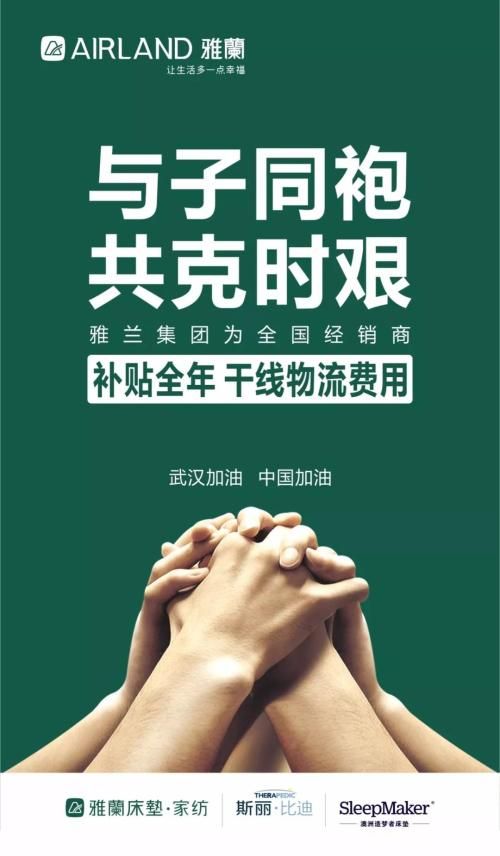 2020年,雅兰全额承担全国经销商全年干线物流费用(从工厂至经销商仓库);该政策对包含雅兰集团旗下品牌(雅兰床垫、雅兰家纺、斯丽比迪、造梦者)所有国内销售品类有效。