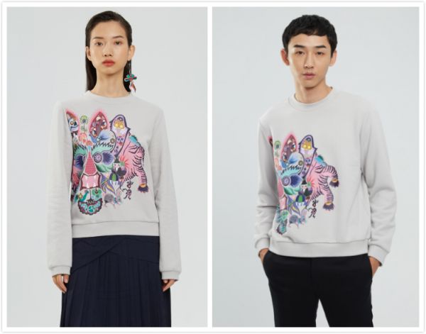 “虎头鞋”系列纹样色彩夸张,形态生动顽皮,本季「上下」全新创作层次丰富的手绘纹样,以蜜蜂、飞鸟、上下纹章、太阳花等缤纷元素,组成色彩斑斓的虎头图腾,卫衣休闲舒适,触感柔软,打造闲逸暖暖情侣,蕴意情意绵绵与对未来生活的美好祝愿。