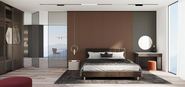 再如我乐全屋定制新品莱奥系列或莫兰迪系列,设计师于床头和梳妆区,分别巧妙运用了棕红皮纹系列和深灰皮纹系列两种护墙板混搭,深浅取色的层次搭配,多元材质的相交融合,让低调奢华的浪漫氛围走进生活。