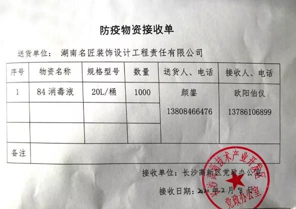 为支援防疫前线,践行企业担当,名匠装饰通过了解到防疫一线出现物资紧缺的情况。经过多方努力奔走,遍寻全国货源,2020年2月8日,名匠装饰首批防疫物资20吨84消毒液,已全部捐赠至长沙高新区管委会;第二批10万个医用外科口罩,全部捐赠至防疫一线。