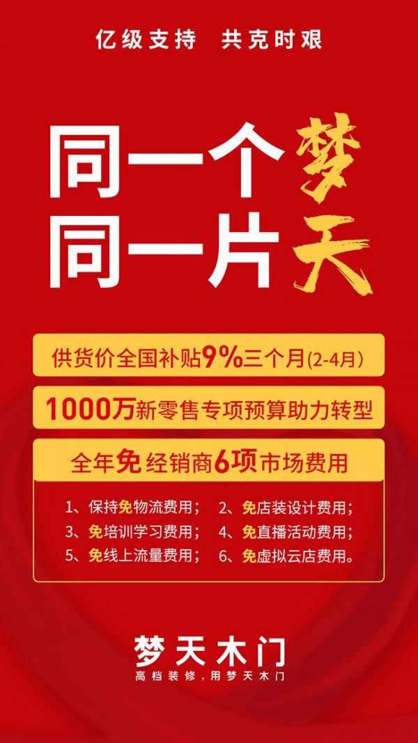 为缓解经销商的经营压力,梦天总部积极推出各种应对措施,以亿元组合资源补贴市场,誓与全体经销商齐心战“疫”、共克时艰。