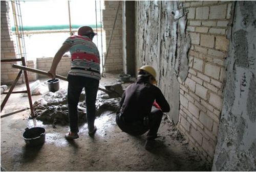 3、抹底灰时必须要到标筋有足够的强度以后,给墙面进行洒水让墙面湿透,然后在两筋之中在抹上底灰,之后在使用木抹子进行压实搓毛,底灰要稍低于标筋。