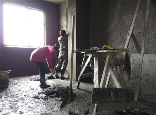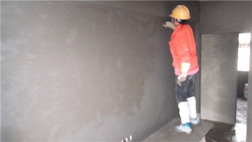 5、抹底灰需要到标筋有足够的强度后,在墙面喷水让墙面润透,而后在两筋当中用劲抹上底灰,在用木抹子压实搓毛,底灰要稍低于标筋。