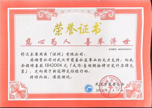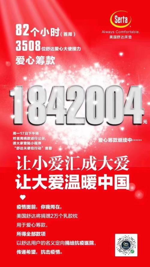 据了解,本次“舒达天使在行动”暖心计划将分为几个周期捐出总价值2万个乳胶枕用于爱心筹款。在每一个捐赠周期结束后,每周一将汇出上周销售所得,并在“舒达天使在行动”微信小程序活动页面进行公示。首个活动周期里销售所得的1842004元善款将以舒达用户的名义捐给武汉慈善总会,并定向捐给抗疫医院,用于防治疫情。