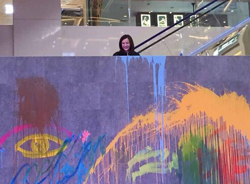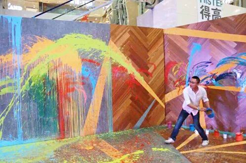 由她现场创作的以色彩表现当下情绪的作品——“木色随心”极富想象力,将得高地板的纹路与色泽之美展现无遗。地板与色彩的完美搭配设计,获得现场设计师的一致赞赏。刘孜还邀请同场的200多位设计师用色彩“泼”出自己的情绪,现场嗨成一片。并在活动结束前爬到舞台最高处,用泼漆的方式创造出一幅色彩浓烈的画作,将本次活动推向高潮。
