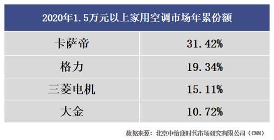 事实证明,需求依然存在,而且多集中在高端空调领域。中怡康数据显示,截止到第6周,在1.5万元以上家用空调市场,年累份额排名第一的是卡萨帝,占比达31.42%。格力占比19.34%,三菱电机占比15.11%。