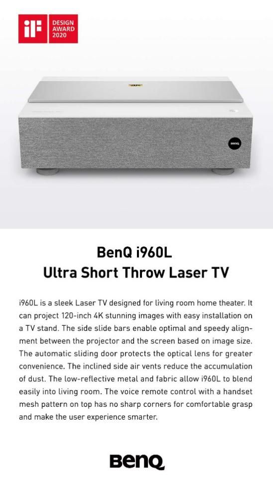 近日,2020 iF评选结果揭晓,明基品牌激光电视 i965L/i960L系列荣膺大奖。至此,明基BenQ所获iF设计大奖累计达150项,近5年(2016-2020)获奖数名列全亚洲品牌排行TOP25。