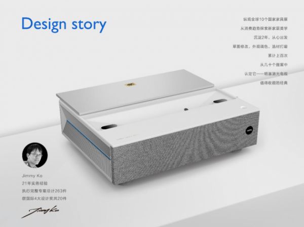 在接到激光电视i965L/i960L系列设计专案时,柯俊民带领团队充分调研全球家居艺术展,把握前沿,将符合现代家庭生活的设计语言运用到激光电视产品设计中。