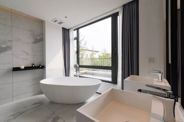 沐浴,是一天中最愉悦身心的事,当温度合意的热水浸没身体,仿佛就要把所有的疲惫细胞一一净化,重焕活力。窗框的氟碳灰配色与泼墨山水画般的陶瓷纹理相得益彰,空间的精致设计,也给人恰然的欢愉。