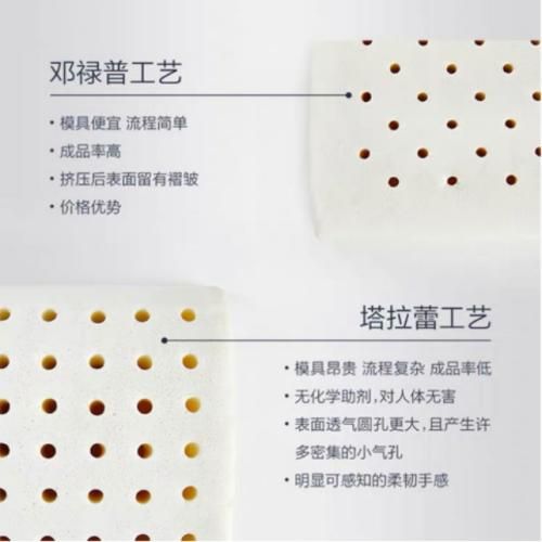 区别与以往产品邓禄普的发泡工艺,此款新品选择特拉雷发泡工艺。特拉雷发泡工艺:采用的是物理发泡工艺(吸真空,低温冷却),先注模后发泡。同样质量的乳胶料可以发泡更大的体积,特拉雷的乳胶枕内部更蓬松、更透气。