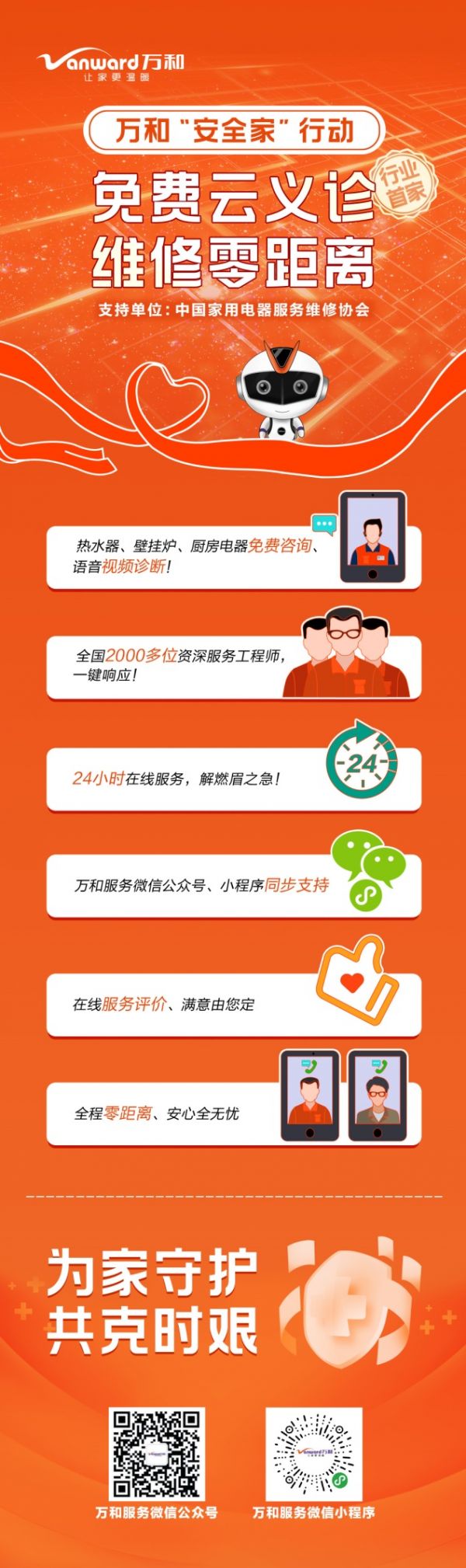 疫情当前,“宅”就是“贡献”。然而此时家中热水器、厨电却突发小状况,搅乱了“宅生活”怎么办?作为热水器与厨电领域头部品牌,万和今日宣布发起“安全家”守护行动,在业内率先推出面向全国的在线“云义诊”与“安心装”两大安心服务,旨在帮助用户快捷高效、安全可靠地解决热水器与厨电突发状况,解除疫情期内居家生活的燃眉之急。