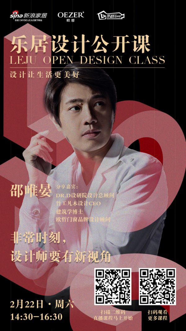 这周六,欧哲门窗联合新浪家居邀请建筑学博士邵唯晏老师,通过直播的方式为大家分享时代的洋流方向,设计行业的潮流和风口,希冀为大家打开一扇窗,获得更宽广的视野。