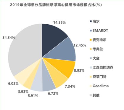 2019年最新数据显示,在大型冷水机组市场销量同比下滑1.33%的情况下,全球磁悬浮离心机组同比增长9.39%,远超冷水机组。在这样一个“技术为王”的领域,全球市场Top5只有一个中国品牌,外资份额占比近5成。其中,海尔以14.35%的市场份额居全球首位,SMARDT、麦克维尔分别以12.45%、8.93%份额位列第二、三位。