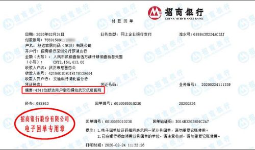 上述爱心善款分别于2月17日、2月24日分两次汇入武汉市慈善总会指定账户,定向捐给抗疫医院,用于防治疫情。期望用最真挚方式带去关心和支持武汉抗疫最前线的所有“战士”。