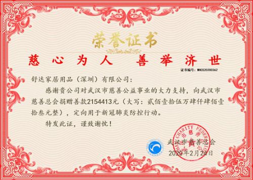 舒达床垫作为一个有着强烈社会责任感的国际品牌,心系湖北地区同胞,继2月7日、2月17日两次向武汉市捐赠之后,2月24日再次以舒达用户名义捐赠2154413元!