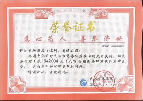 自2月13日下午14:00,“舒达天使在行动”暖心计划准时上线以来,便受到了许许多多舒达爱心大使们的参与和支持,短短48个小时,爱心筹款就突破120万元,在首个活动周期结束时筹款累计1842004元,并以舒达用户的名义捐给武汉慈善总会,并定向捐给抗疫医院,用于防治疫情。