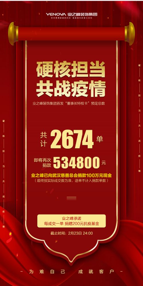 业之峰的行动,也受到了消费者的热情追捧。截至2月23日24时,业之峰“董事长特权卡”已成功预订2674单,累计再次为疫区捐款534800元。