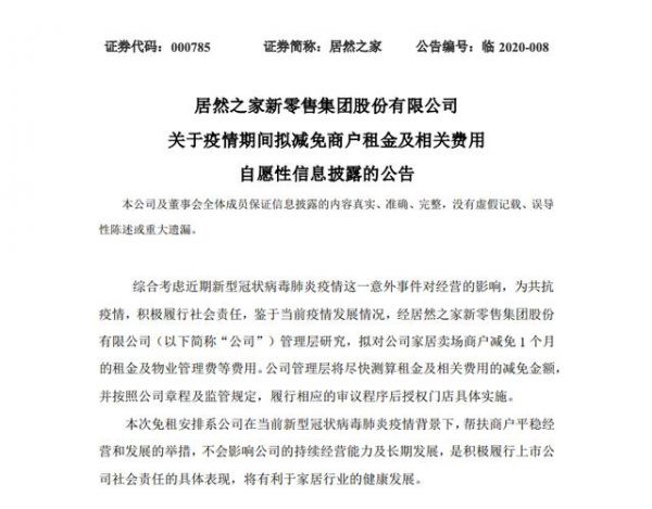 2020年2月25日,居然之家发布《关于疫情期间拟减免商户租金及相关费用自愿性信息披露的公告》,拟将对家居卖场商户减免1个月的租金及物业管理费等费用。