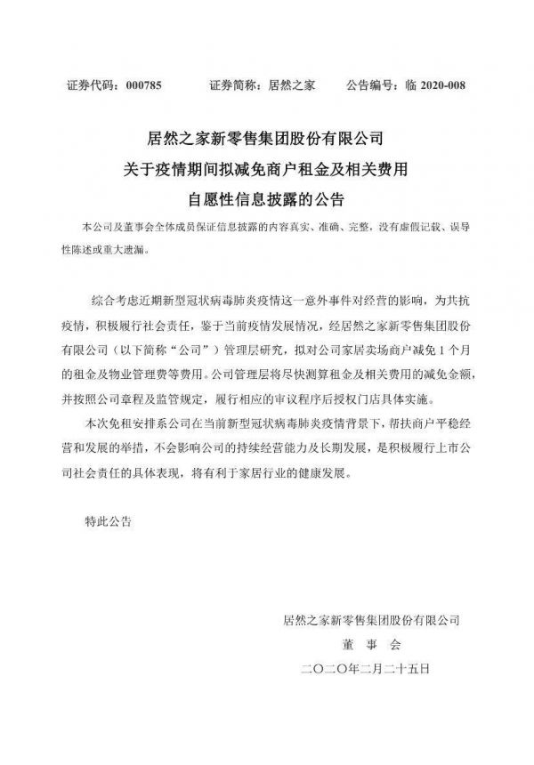 2月25日,居然之家新零售集团股份有限公司(以下简称“居然之家”)发布《关于疫情期间拟减免商户租金及相关费用自愿性信息披露的公告》,公告显示,居然之家拟对家居卖场商户减免1个月的租金及物业管理费等费用。这是继此前居然之家携手网商银行为全国300余家卖场的商户送上15亿元“抗疫贷款”又一帮扶商户的大举措。
