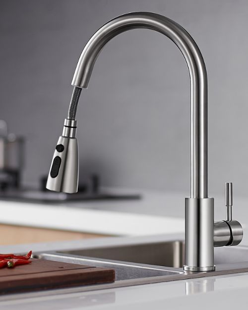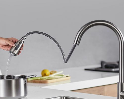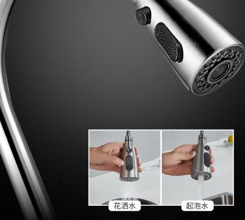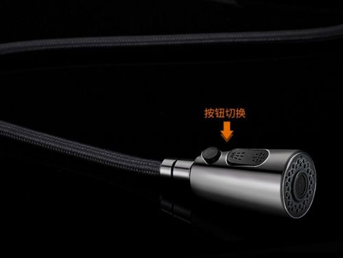 龙头自身采用无涂层的金属拉丝的设计,不容易剥落,也不容易残留指纹,油污等,抽拉的设计更是让灵活程度上升一个档次,直接覆盖整个水槽,不放过任何一处角落。而最精妙的地方在于龙头的一键双模设计。
