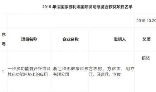 第118届国际发明展览会(列宾竞赛)的颁奖会上,中国发明展团选送的发明项目获得了5金、7银、5铜的成绩,其中和也公司的和运床垫获得银奖,健腰神获得铜奖。