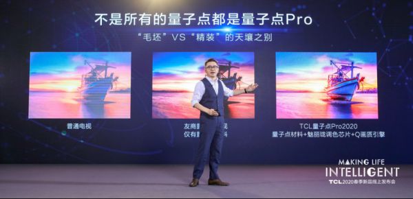 在这样的理念下,TCL此次发布的智能科技产品也将这种思维渗透其中。作为“懂你的大屏音画专家”,TCL发布了TCL C8至臻 QLED TV、TCL P9好莱坞剧院电视以及TCL V8全场景AI电视三大系列新品。其中C8至臻QLED TV正是搭载了量子点Pro2020技术的又一力作。正如王成所着重谈到的“不是所有的量子点都是量子点Pro”。C8的量子点Pro2020技术采用了魅丽珑芯片AI级的调色,同时结合TCL自研的Q画质引擎技术,在亮度、色彩、清晰度等方面做了深度的优化,能最终呈现完美的画质效果。王成在现场还做了一个更形象的比喻:“这就好比同样是大房子,精心设计的精装房一定会比毛坯房更美观更舒适。”