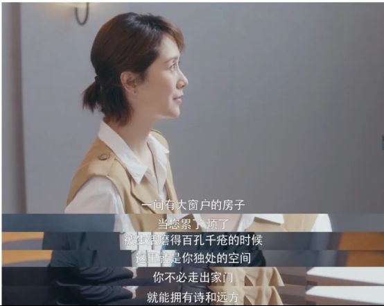 剧中,房店长带宫蓓蓓看房的时候,对她说,“如果能在这个城市拥有一间带大窗户的房间,当被生活磨得百孔千疮的时候,这里是我独处的空间,不必走出家门,就能拥有诗和远方。”