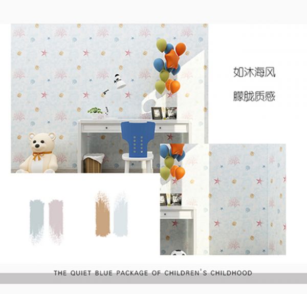 YASLAN墙布采用柔和淡蓝为主色调,更能体现儿童的柔和、纯洁与稚嫩,浅淡灰白作为阴影让空间朦胧有质感,搭配上海底动物元素吸引人眼球的色彩,使空间更加的精彩丰富。