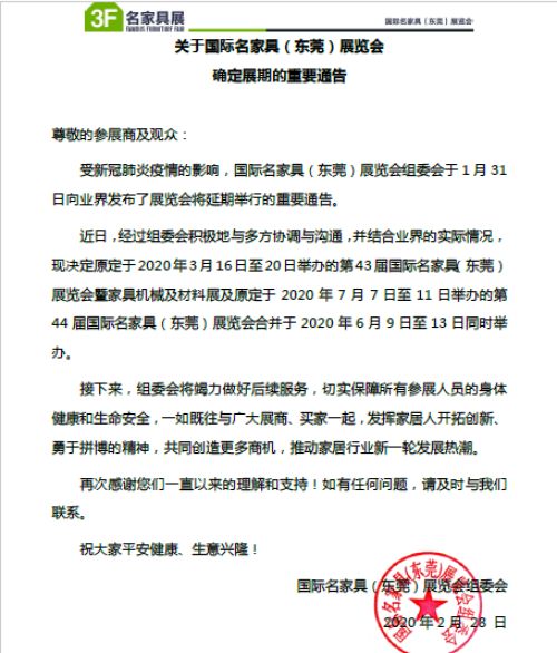 关于国际名家具(东莞)展览会确定展期的重要通告