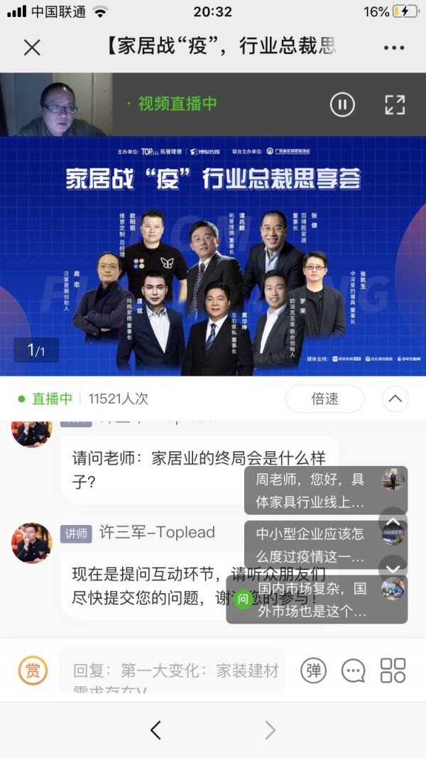 与泛家居行业同仁共同战“疫”,助力家居企业涅槃,为奋斗者们赋能。由拓普理德、博骏传媒发起,联合数十家家居行业商协会联合主办,网易新闻家居、搜狐焦点家居、中华衣柜网、北京商报等媒体支持的【家居战“疫”,行业总裁思享荟】公益直播课程正如火如荼地进行。