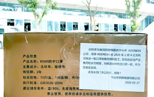2月中旬,正值中国新冠肺炎疫情爆发近一个月。中山市家的电器有限公司,响应政府号召,开始复工复产。此时,公司非常意外地收到一件来自韩国的快递包裹。