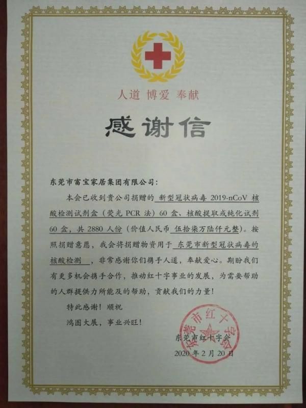 捐助仪式在东莞市红十字会举行,东莞市红十字会常务副会长伍淑筠与东莞市富宝家居集团有限公司执行董事刘莲花等参加,捐赠核酸检测试济盒以表达Frandiss在抗疫阻击战中永不缺席的决心与信念,为需要帮助的人群提供力所能及的帮助。