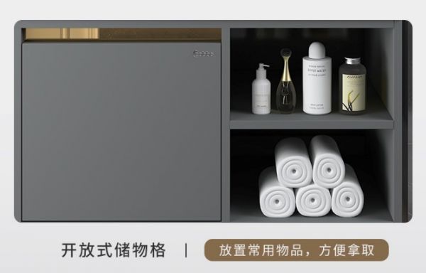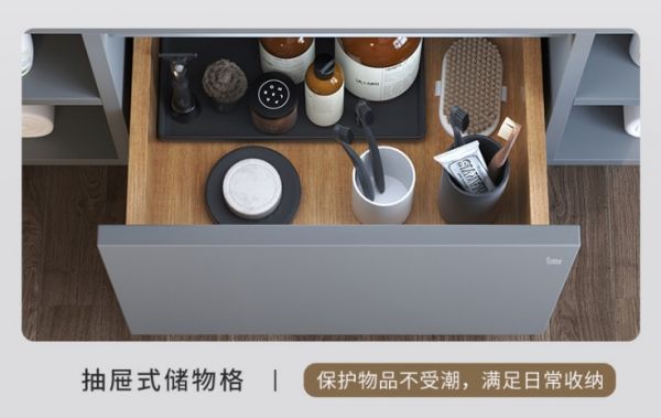 这款浴室柜的半开放式空间是最大的特色,有些物品,虽然暂时用不到,扔掉又有些舍不得,就可以收纳到抽屉式储格里以备应急之需。这款浴室柜在左右两侧是开放式的储物格,没有盖子,适合放置日常使用的化妆品、牙膏牙刷、漱口杯等等,手一伸就能够拿到,非常轻松便捷。