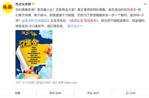 奥克斯空调作为互联网直卖空调的领军者,苏宁易购作为电商巨头之一,基于对社交平台与互联网风向的洞察和了解,率先在各自官方微博发布了#驭风青年#的造词定义,并联合多位微博大V以及知乎大V对#驭风青年#进行定义和扩散。