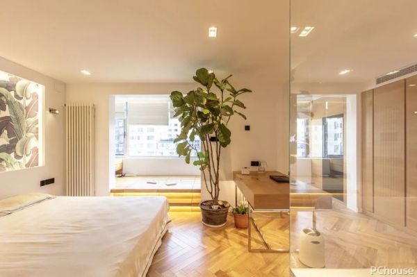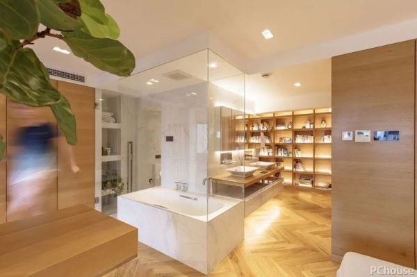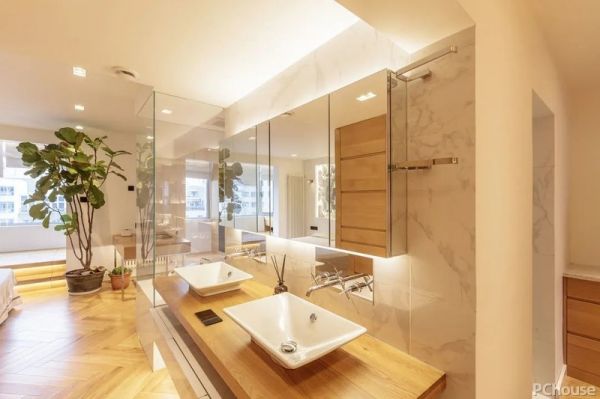 2.由于主卫的承重墙体不能拆,索性把浴缸和干区包在卫生间外面,浴缸通过玻璃围挡,保证水汽不会向外扩散,外置的干区盥洗台与衣帽柜过道布局在一起,优化动线。