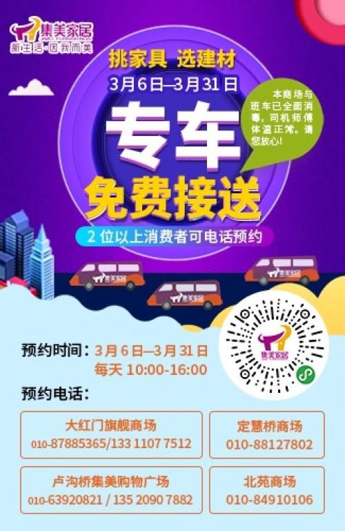 为方便消费者出行,3月6日-3月31日,集美家居开通2人以上(含2人)可享购物专che免费接送服务,包括大红门旗舰商场、卢沟桥集美购物广场、定慧桥商场、北苑商场在内的四家商场同时启动。集美家居表示,商场和专车均已全面消毒,司机师傅体温正常,通过拨打以下各商场专车预约电话即可预约。