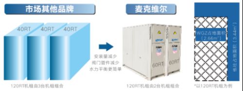 “麦克维尔全新一代模块式水冷涡旋机组新增60RT大容量单机模块,满足中大型冷量项目需求。”黄成才道:“大冷量需求时,减少了主机数量,机组安装空间更小,安装工程量更少且大大节省占地面积。同时有利于空调水系统水力平衡,减少管阀件的数量,极大限度节省投资成本。模块内3-4台压缩机可互为备用,多台模块组合后彼此间互为备用,可靠性高。可实现最多16台模块组合数量,冷量选型不产生浪费。”