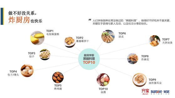 厨房小家电爆红的背后逻辑是“热爱生活”。疫情引发的另一个有趣现象是“全民学厨”,无论过往有没有下厨经验的居民,都开始纷纷探索厨房新世界。根据齐家网报告,人们学做各种往常没做过的“黑暗料理”,做得好不好吃并不是关键,关键在于获得与家人互动、以及社交分享的快乐。疫情下居民学厨黑暗料理TOP10中,电饭锅蛋糕、蔓越莓饼干、饺子、包子/馒头、烤鸡翅分别排名前5位,备受人们追捧。
