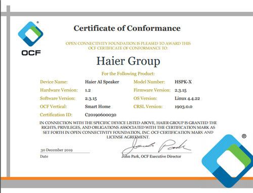目前,已搭载OCF-U+ Bridging国际标准的海尔AI智能音箱,第一个通过了OCF桥接认证。