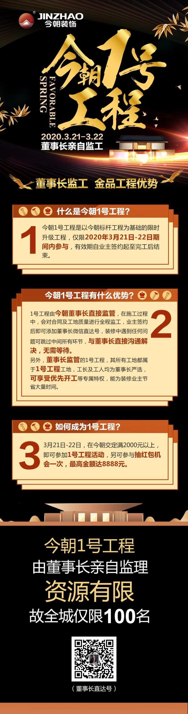 为了近一步落实对客户满意度的提升,有效利用线上平台。今朝装饰于3月21日——22日,推出了新的项目“今朝1号工程”。该工程由董事长戴江平直接监管,在施工过程中对合同及工地质量进行全程监工。不仅如此,业主签约后可添加戴江平的微信直达号,装修中遇到任何问题都可与董事长直接沟通,无需等待。