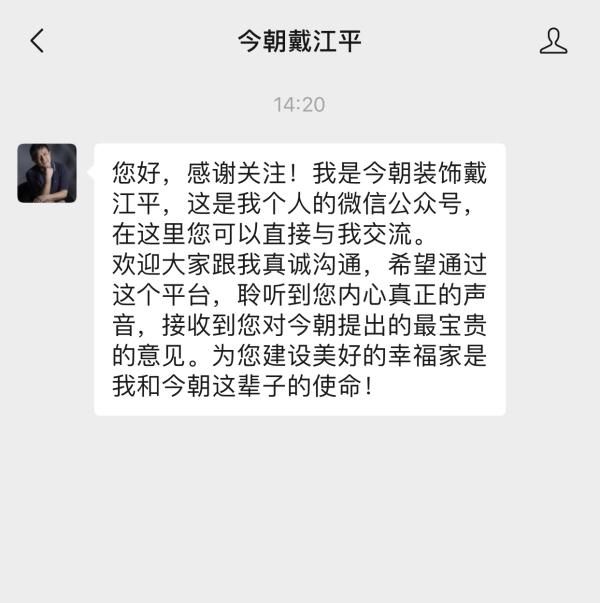 想要提高家装行业的水平,降低服务的投诉率,需要更透明更公开的方式。2020年3月11日,今朝装饰董事长正式于微信平台开通了个人服务账号。