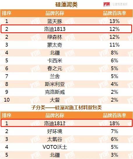 3月18日,在优采平台公布的《2020中国房地产开发企业500强测评报告》与《2020中国房地产开发企业500强首选供应商服务商品牌测评报告》结果中,洛迪科技品牌“洛迪1813”以12%的品牌首选率在硅藻泥类榜单中排名第二,并以18%的品牌首选率位列硅藻泥施工材料双包类榜单第一名。