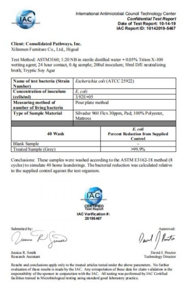 据经权威机构SGS和ICA检测,喜临门双核新品抗菌率高达99.9999%,是国家标准的100倍,即使水洗40次,也能保证99.9%的抗菌率。