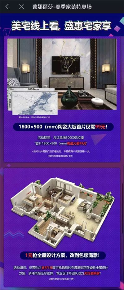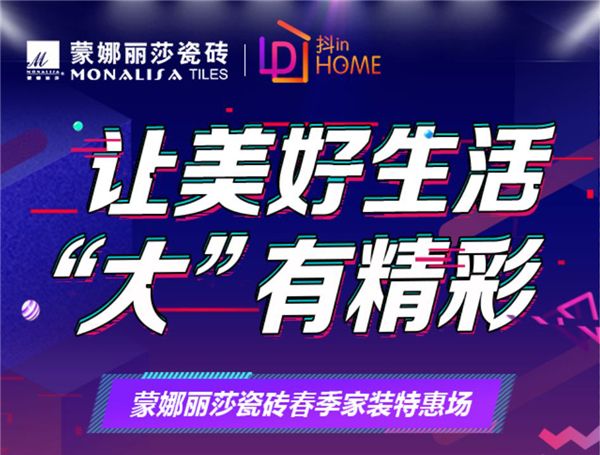 同时,活动搭建了“抖in home”家装大牌特惠场,设置了大牌聚惠区、直省6万区、互动抽奖区、城市分会场、爆款清单区等核心板块,并联合全品类家居品牌为用户提供了各种组合福利,以钜惠掀起2020年春季置家购物热潮。作为此次抖音家居节合作品牌,蒙娜丽莎瓷砖为抖音用户提供“陶瓷大板99元”、“300元铺贴代金券”、“9.9元购10㎡精致厨卫瓷砖”、“1元定制全屋设计方案”等多重优惠政策。让网友足不出户,也能享受到置家购物的乐趣,更能尊享到诚意满满的优惠福利。