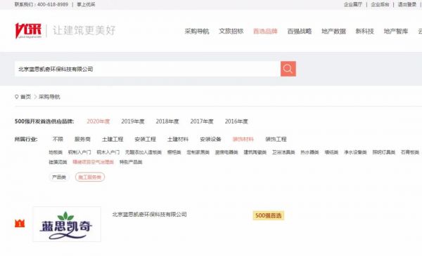 在行业权威的优采大数据平台上,“2020年中国房地产开发企业500强首选供应商榜单”中,蓝思凯奇荣登2020年中国房地产开发企业500强首选供应商评测榜单的精装项目空气治理施工服务行列。