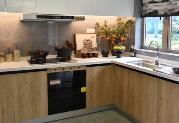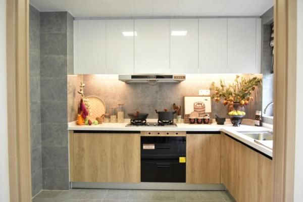 普适性强的L字型橱柜尤其适合方正的小面积厨房,门板可采用明亮一点的木纹色与牛奶白进行搭配,显得空间温馨雅致,整洁大方。