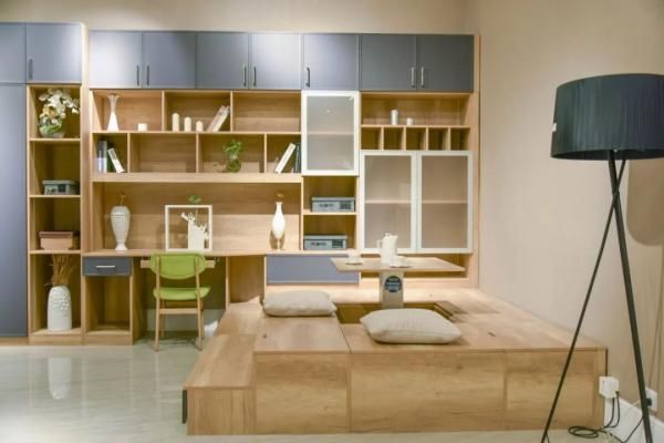 塌塌米和书桌柜的设计结合在一起,形成互补,可以在这里安静地看书,还可以是一间舒适的客房,让人在书的怀抱中安睡。正面墙为开放式收纳柜,可摆放书籍或者装饰品,美观又实用;侧面的榻榻米可作为休闲区或休息区,内置升降式的小桌子可转变功能,升起时化身桌子,降下时则变成一张双人床。