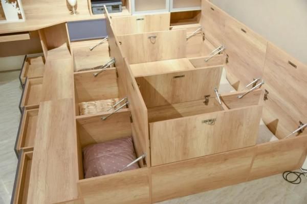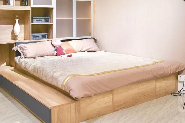 榻榻米的底部还暗藏着8个收纳柜,过季的衣物、备用的被褥都有了去处,轻松破解小户型空间小的收纳难题。